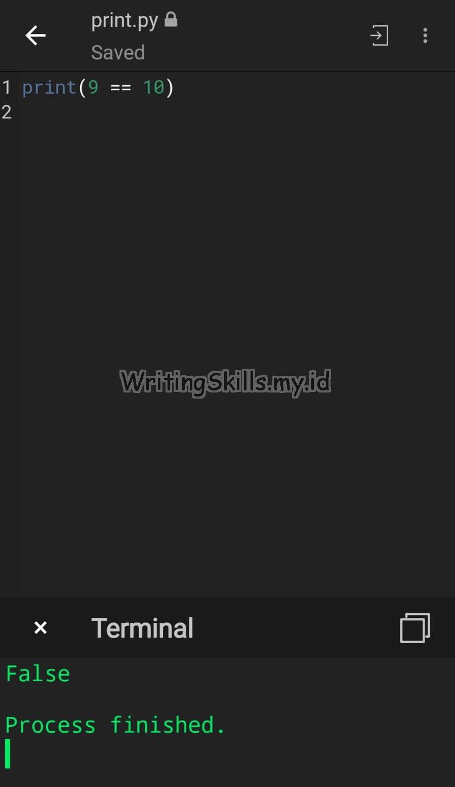 Saat kita membandingkan angka yang berbeda dengan equality operator, output atau hasilnya adalah False. Sebagai contoh, kita akan membandingkan angka 9 dan 10.